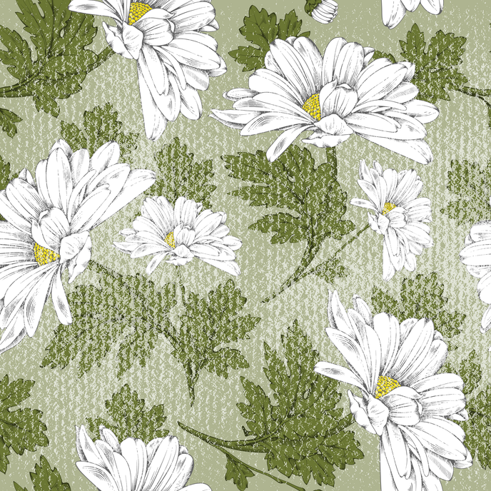 Meet Lila, a radiant pattern bursting with wild charm. With a canvas-inspired texture that adds depth and a lived-in warmth, Dancing Daisies is where golden yellows, crisp whites, and lush leafy greens swirl over a soft green backdrop—like a sun-drenched meadow frozen in full bloom.
